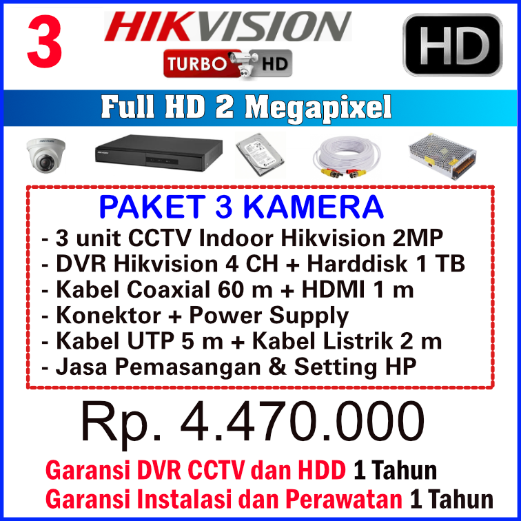 Paket CCTV Hikvision 3 Kamera 2 Megapixel